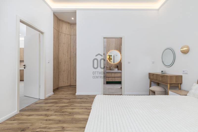 Belbuda egyik legnyugodtabb részén, a Várnegyed közvetlen közelében kínáljuk megvételre ezt a magas emeleti, prémium minőségben felújított lakást, ahol a városi lét ritka csenddel és zöld kilátással párosul. Az ablakok lombkoronákra néznek, madárcsicsergéssel.A lakás 112 m² hasznos alapterületű (tulajdoni lapon 101 m²), kelet–nyugati tájolásának köszönhetően egész nap világos. Sarokelhelyezkedése és átgondolt kialakítása valódi privát életteret biztosít.Három külön nyíló hálószoba és két teljes értékű fürdőszoba került kialakításra. A fő hálószoba saját fürdővel és gardróbhelyiséggel rendelkezik, amely kényelmében egy boutique hotel szintjét idézi. A további szobák teljes értékűek, jól szeparáltak – ideálisak családi használatra vagy otthoni munkavégzéshez.Az enteriőr Japandi stílusban készült: letisztult, természetes és időtálló. A felújítás nemcsak esztétikai, hanem műszaki szinten is teljes körű volt, így az új tulajdonosnak nem terveznie vagy kiviteleznie kell – csak beköltözni.Rövid összefoglaló – a lényeg egyben- 112 m² hasznos alapterület (tulajdoni lapon 101 m²)- Magas emelet, liftes társasház (nem tetőtér)- 3 külön nyíló hálószoba- 2 teljes értékű fürdőszoba- Saroklakás, átmenő forgalomtól mentes elhelyezkedés- Kelet–nyugati tájolás, egész nap világos- Zöld lombkoronákra néző kilátás- Japandi stílusú, prémium belsőépítészeti kialakítás- A felújítás óta még nem lakott- Mélygarázs vásárolható vagy bérelhető a szomszédos épületben (1 db vásárolható, vagy 2 db bérelhető)A rendezett, liftes társasház két utcáról megközelíthető, az egyik oldali homlokzat felújítása már megtörtént. A Vérmező, a Várnegyed és Belbuda frekventált pontjai néhány perc alatt elérhetők, miközben az utca megőrzi nyugodt, elegáns karakterét.Ez az ingatlan nem kompromisszum, hanem tudatos választás azoknak, akik kész, magas színvonalú otthont keresnek Belbuda egyik legjobb lokációjában.