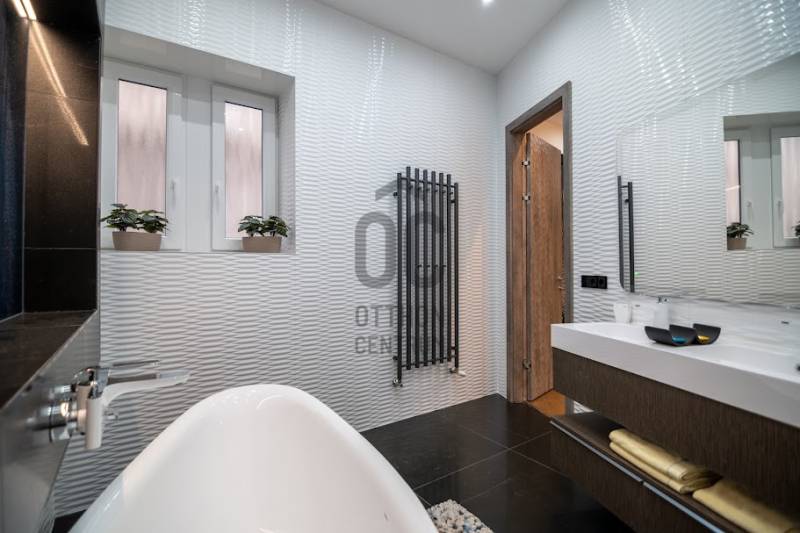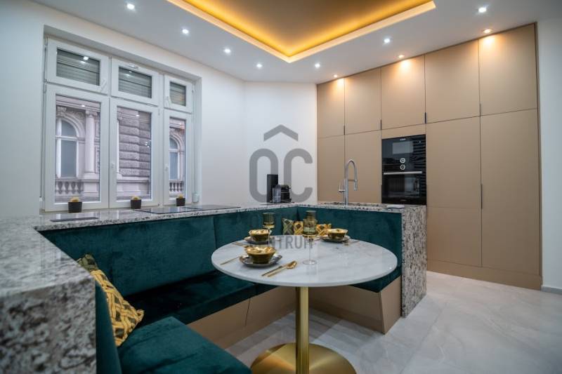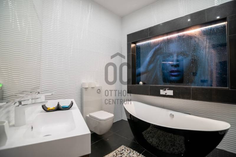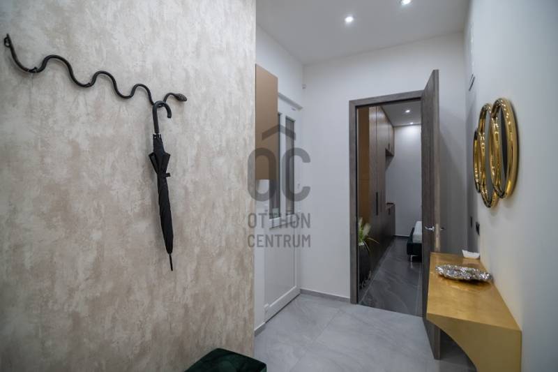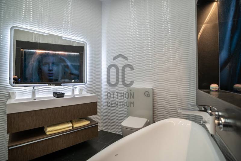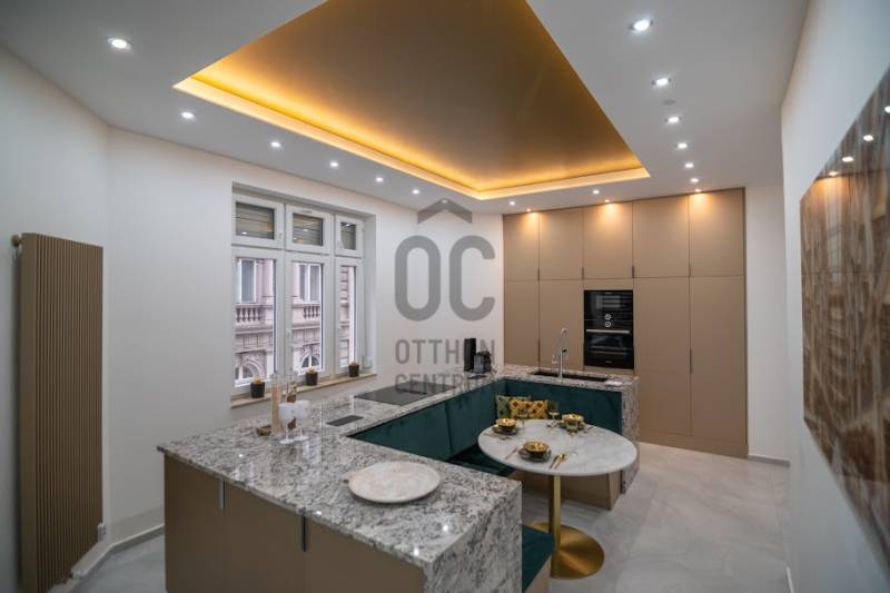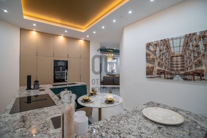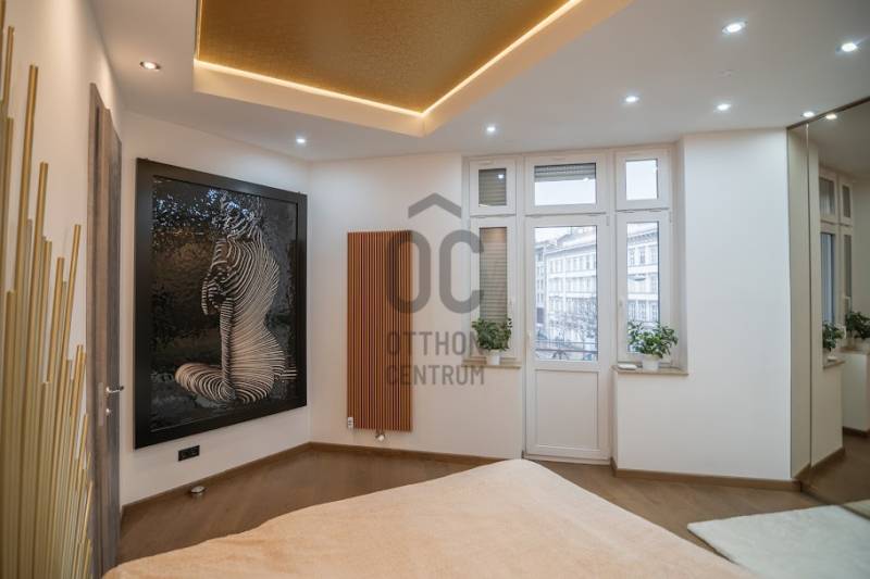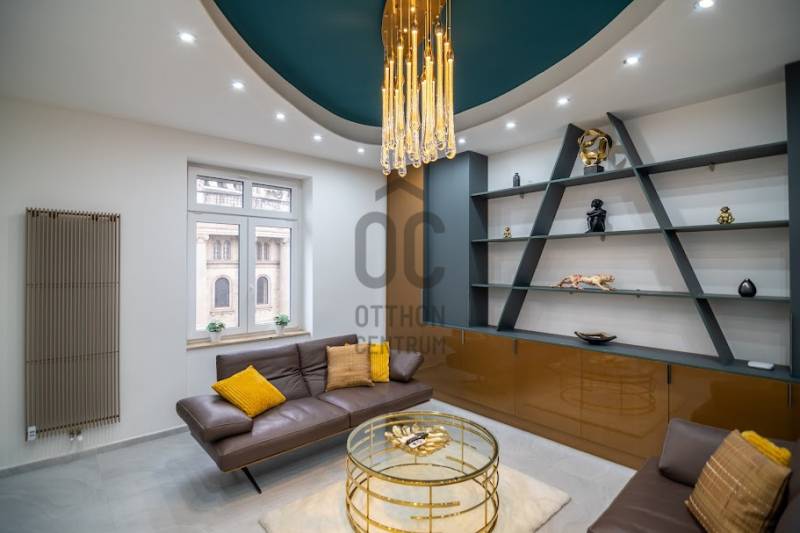 Prémium minőségben felújított luxuslakás, panorámával a Szent István BazilikáraEladásra kínálunk a Szent István Bazilikával szemben, egy felújított, liftes társasház második emeletén található, kivételes adottságokkal rendelkező luxuslakást. Az ingatlan igényes lakberendezői tervezés eredménye, ahol a funkcionalitás és az elegancia tökéletes összhangban van.A lakás nagyvonalú terekkel rendelkezik, egyedi hangulatát neves designerek által tervezett bútorok és kiegészítők határozzák meg. A nappali központi eleme a látványkandalló, ahonnan a kanapén pihenve közvetlen kilátás nyílik a Bazilikára.Az átgondolt elrendezésű ingatlan tágas nappalival, nagyméretű étkezős konyhával, valamint két, saját fürdőszobával rendelkező hálószobával rendelkezik. A vendégek számára külön mosdó került kialakításra.A felújítás során kiemelt szempont volt a magas minőségű anyaghasználat, valamint az elegáns, letisztult életterek kialakítása.A fűtést mérhető központi fűtés biztosítja, míg a hűtésről minden helyiségben felszerelt, prémium minőségű klímaberendezések gondoskodnak.Az ingatlan teljes bútorzattal és gépészettel együtt kerül értékesítésre, melyek a vételár részét képezik.Igény esetén a közelben található Central Passage parkolóházban akár több parkolóhely is vásárolható, 17 millió Ft / hely irányáron.A lakás Budapest szívében, a VI. kerület frekventált részén helyezkedik el. A város ikonikus látnivalói – Szent István Bazilika, Zsinagóga, Operaház – mind sétatávolságon belül elérhetők. A környék számos hangulatos kávézóval, étteremmel, a Gozsdu Udvarral és az Óriáskerékkel is várja az itt lakókat.A közlekedés kiváló: metró-, villamos- és buszmegállók néhány perc sétára találhatók.