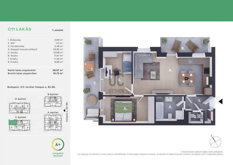Projekt bemutatásaA Daisy Liget Zugló csendes részén épül, közel a Bosnyék térhez. A megújult kertvárosias környezet a pesti oldal egyik legkedveltebb részei közé tartozik, az itt élők egyszerre élvezhetik a csöndes kis utcák nyugalmát és a belváros közelségét. A Bosnyák téren mindent megtalálunk ami a hétköznapi élethez szükséges: a Zenit corso bevásárlóközpontot, a Bosnyák téri piacot, patikát, éttermeket és kávézókat.Számos óvodát, általános iskolát, játszóteret és sportközpontot is találunk a 10 perces sétatávolságon belül.A társasház különleges homlokzatával, egyedi fiatalos dizájnjával, kiemelkedik a környező épületek közül. A 4 emelet magas, szellősen elhelyezett épületek tökéletesen illeszkednek a környéken jellegzetes, előkertes kialakítású épületekhez.Figyelembe véve a jövő elvárásait, a társasház modern, környezetbarát, mennyezeti hűtő, -fűtő rendszerrel ellátott.Vevőinknek lehetőségük nyílik, hogy új otthonukat az utolsó részletig személyre szabják: változtathatnak az ingatlann elosztásán, széles kollekcióból választhatnak meleg- és hideg burkolatokat, szanitereket. Az alapáras burkolatokon felül, elérhetőek feláras termékek is, mely biztosítja, hogy olyan lakásban lakjanak mit megálmodtak maguknak.A fizetési ütemezés: 10-90%A jelen adatok tájékoztató jellegűek, ezért a Beruházó (sem a hirdető) azok változásával, vagy bármely attól való eltéréssel kapcsolatban semmilyen kötelezettséget, vagy felelősséget nem vállal.Az alaprajzokon ábrázolt berendezési tárgyak és bútorok, a burkolatok megjelenése nem képezi a szerződés tárgyát. A pontos felszereltségről a műszaki leírásban olvashat bővebben.Az aktuális lakáskínálatról és árakról érdeklődjön telefonon!