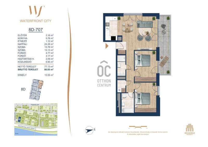 Projekt bemutatásaA projektrőlA Waterfront City egy új, modern városnegyed a 3. kerületben, ahol a természet közelsége és a városi kényelem tökéletes egyensúlyban van. A Duna-part közvetlen szomszédságában elhelyezkedő fejlesztés különleges atmoszférát kínál: a sétányt új épületek határolják, üzletekkel, kávézókkal és szolgáltatásokkal, amelyek élhető közösségi teret teremtenek.A 13 emeletes lakóépületből lenyűgöző örökpanoráma nyílik a budai hegyekre és a folyóra, a tágas teraszok pedig ideálisak a pihenéshez vagy a baráti összejövetelekhez. A zöldtetők, parkosított terek és fenntartható megoldások – mint az energiatakarékos rendszerek és okos otthon funkciók – mind hozzájárulnak a modern, környezettudatos életstílushoz.Látogass el értékesítési irodánkba, és tekintsd meg a városnegyed makettjét személyesen! Ismerd meg, milyen lesz az élet Budapest egyik legizgalmasabb új fejlesztésében!Óbuda szívébenKépzeld el, ahogy egy napsütéses délelőttön Óbuda szívében sétálsz, a Duna közelsége frissítően hat rád, miközben a Folyamőr utca, a Miklós tér és a Bogdáni út által határolt, öt hektáros területre érsz. A levegőben ott van a város történelme, mégis minden részletében a jövő hívogat.A 50 000 négyzetméteres területen egy hangulatos sétány vezet végig, amely egyenesen az óbudai Fő térre visz – mindössze 600 méterre. Ez a sétány nem csupán összeköt, hanem élményt nyújt: a Kolosy térről induló Óbudai Promenád részeként a város egyik legélhetőbb, legpezsgőbb szakaszán haladsz végig. És ha biciklivel érkeznél? A nemzetközi kerékpárút is itt halad el, Szentendre felé vezetve.Az 5. ütemben épülő 149 lakás mindegyike egyedi hangulatot kínál. Ahogy belépsz egy-egy otthonba, a hatalmas üvegfelületeken át beáradó fény és a tágas, szellős terek azonnal magukkal ragadnak. A kilátás? A Kaszap István park zöldje nyújt békét, míg a felsőbb emeletekről a Budai-hegység örökpanorámája tárul eléd – minden nap egy új festmény az ablakodban.A 6. ütemben 316 modern lakás épül, tágas teraszokkal és lenyűgöző kilátással a Dunára és a budai hegyekre. A lakók kényelmét őrszolgálat, kamerarendszer, mélygarázs, vendéglátóhelyek, belső park, játszótér és E-autó töltők szolgálják. Ez a projekt utolsó üteme, amely még közvetlen Duna-parti kapcsolattal rendelkezik.