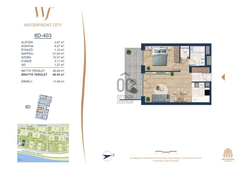 Projekt bemutatásaA projektrőlA Waterfront City egy új, modern városnegyed a 3. kerületben, ahol a természet közelsége és a városi kényelem tökéletes egyensúlyban van. A Duna-part közvetlen szomszédságában elhelyezkedő fejlesztés különleges atmoszférát kínál: a sétányt új épületek határolják, üzletekkel, kávézókkal és szolgáltatásokkal, amelyek élhető közösségi teret teremtenek.A 13 emeletes lakóépületből lenyűgöző örökpanoráma nyílik a budai hegyekre és a folyóra, a tágas teraszok pedig ideálisak a pihenéshez vagy a baráti összejövetelekhez. A zöldtetők, parkosított terek és fenntartható megoldások – mint az energiatakarékos rendszerek és okos otthon funkciók – mind hozzájárulnak a modern, környezettudatos életstílushoz.Látogass el értékesítési irodánkba, és tekintsd meg a városnegyed makettjét személyesen! Ismerd meg, milyen lesz az élet Budapest egyik legizgalmasabb új fejlesztésében!Óbuda szívébenKépzeld el, ahogy egy napsütéses délelőttön Óbuda szívében sétálsz, a Duna közelsége frissítően hat rád, miközben a Folyamőr utca, a Miklós tér és a Bogdáni út által határolt, öt hektáros területre érsz. A levegőben ott van a város történelme, mégis minden részletében a jövő hívogat.A 50 000 négyzetméteres területen egy hangulatos sétány vezet végig, amely egyenesen az óbudai Fő térre visz – mindössze 600 méterre. Ez a sétány nem csupán összeköt, hanem élményt nyújt: a Kolosy térről induló Óbudai Promenád részeként a város egyik legélhetőbb, legpezsgőbb szakaszán haladsz végig. És ha biciklivel érkeznél? A nemzetközi kerékpárút is itt halad el, Szentendre felé vezetve.Az 5. ütemben épülő 149 lakás mindegyike egyedi hangulatot kínál. Ahogy belépsz egy-egy otthonba, a hatalmas üvegfelületeken át beáradó fény és a tágas, szellős terek azonnal magukkal ragadnak. A kilátás? A Kaszap István park zöldje nyújt békét, míg a felsőbb emeletekről a Budai-hegység örökpanorámája tárul eléd – minden nap egy új festmény az ablakodban.A 6. ütemben 316 modern lakás épül, tágas teraszokkal és lenyűgöző kilátással a Dunára és a budai hegyekre. A lakók kényelmét őrszolgálat, kamerarendszer, mélygarázs, vendéglátóhelyek, belső park, játszótér és E-autó töltők szolgálják. Ez a projekt utolsó üteme, amely még közvetlen Duna-parti kapcsolattal rendelkezik.