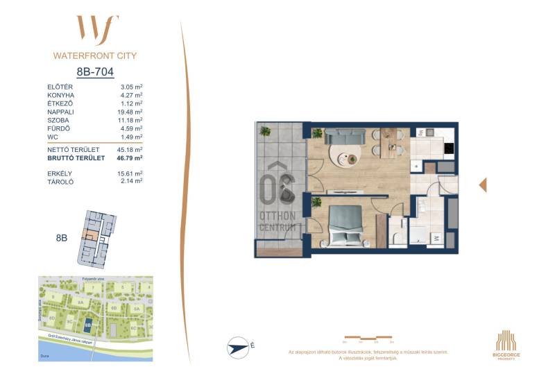 Projekt bemutatásaA projektrőlA Waterfront City egy új, modern városnegyed a 3. kerületben, ahol a természet közelsége és a városi kényelem tökéletes egyensúlyban van. A Duna-part közvetlen szomszédságában elhelyezkedő fejlesztés különleges atmoszférát kínál: a sétányt új épületek határolják, üzletekkel, kávézókkal és szolgáltatásokkal, amelyek élhető közösségi teret teremtenek.A 13 emeletes lakóépületből lenyűgöző örökpanoráma nyílik a budai hegyekre és a folyóra, a tágas teraszok pedig ideálisak a pihenéshez vagy a baráti összejövetelekhez. A zöldtetők, parkosított terek és fenntartható megoldások – mint az energiatakarékos rendszerek és okos otthon funkciók – mind hozzájárulnak a modern, környezettudatos életstílushoz.Látogass el értékesítési irodánkba, és tekintsd meg a városnegyed makettjét személyesen! Ismerd meg, milyen lesz az élet Budapest egyik legizgalmasabb új fejlesztésében!Óbuda szívébenKépzeld el, ahogy egy napsütéses délelőttön Óbuda szívében sétálsz, a Duna közelsége frissítően hat rád, miközben a Folyamőr utca, a Miklós tér és a Bogdáni út által határolt, öt hektáros területre érsz. A levegőben ott van a város történelme, mégis minden részletében a jövő hívogat.A 50 000 négyzetméteres területen egy hangulatos sétány vezet végig, amely egyenesen az óbudai Fő térre visz – mindössze 600 méterre. Ez a sétány nem csupán összeköt, hanem élményt nyújt: a Kolosy térről induló Óbudai Promenád részeként a város egyik legélhetőbb, legpezsgőbb szakaszán haladsz végig. És ha biciklivel érkeznél? A nemzetközi kerékpárút is itt halad el, Szentendre felé vezetve.Az 5. ütemben épülő 149 lakás mindegyike egyedi hangulatot kínál. Ahogy belépsz egy-egy otthonba, a hatalmas üvegfelületeken át beáradó fény és a tágas, szellős terek azonnal magukkal ragadnak. A kilátás? A Kaszap István park zöldje nyújt békét, míg a felsőbb emeletekről a Budai-hegység örökpanorámája tárul eléd – minden nap egy új festmény az ablakodban.A 6. ütemben 316 modern lakás épül, tágas teraszokkal és lenyűgöző kilátással a Dunára és a budai hegyekre. A lakók kényelmét őrszolgálat, kamerarendszer, mélygarázs, vendéglátóhelyek, belső park, játszótér és E-autó töltők szolgálják. Ez a projekt utolsó üteme, amely még közvetlen Duna-parti kapcsolattal rendelkezik.