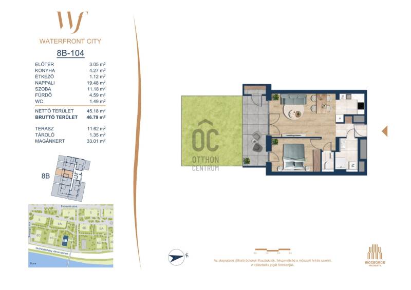 Projekt bemutatásaA projektrőlA Waterfront City egy új, modern városnegyed a 3. kerületben, ahol a természet közelsége és a városi kényelem tökéletes egyensúlyban van. A Duna-part közvetlen szomszédságában elhelyezkedő fejlesztés különleges atmoszférát kínál: a sétányt új épületek határolják, üzletekkel, kávézókkal és szolgáltatásokkal, amelyek élhető közösségi teret teremtenek.A 13 emeletes lakóépületből lenyűgöző örökpanoráma nyílik a budai hegyekre és a folyóra, a tágas teraszok pedig ideálisak a pihenéshez vagy a baráti összejövetelekhez. A zöldtetők, parkosított terek és fenntartható megoldások – mint az energiatakarékos rendszerek és okos otthon funkciók – mind hozzájárulnak a modern, környezettudatos életstílushoz.Látogass el értékesítési irodánkba, és tekintsd meg a városnegyed makettjét személyesen! Ismerd meg, milyen lesz az élet Budapest egyik legizgalmasabb új fejlesztésében!Óbuda szívébenKépzeld el, ahogy egy napsütéses délelőttön Óbuda szívében sétálsz, a Duna közelsége frissítően hat rád, miközben a Folyamőr utca, a Miklós tér és a Bogdáni út által határolt, öt hektáros területre érsz. A levegőben ott van a város történelme, mégis minden részletében a jövő hívogat.A 50 000 négyzetméteres területen egy hangulatos sétány vezet végig, amely egyenesen az óbudai Fő térre visz – mindössze 600 méterre. Ez a sétány nem csupán összeköt, hanem élményt nyújt: a Kolosy térről induló Óbudai Promenád részeként a város egyik legélhetőbb, legpezsgőbb szakaszán haladsz végig. És ha biciklivel érkeznél? A nemzetközi kerékpárút is itt halad el, Szentendre felé vezetve.Az 5. ütemben épülő 149 lakás mindegyike egyedi hangulatot kínál. Ahogy belépsz egy-egy otthonba, a hatalmas üvegfelületeken át beáradó fény és a tágas, szellős terek azonnal magukkal ragadnak. A kilátás? A Kaszap István park zöldje nyújt békét, míg a felsőbb emeletekről a Budai-hegység örökpanorámája tárul eléd – minden nap egy új festmény az ablakodban.A 6. ütemben 316 modern lakás épül, tágas teraszokkal és lenyűgöző kilátással a Dunára és a budai hegyekre. A lakók kényelmét őrszolgálat, kamerarendszer, mélygarázs, vendéglátóhelyek, belső park, játszótér és E-autó töltők szolgálják. Ez a projekt utolsó üteme, amely még közvetlen Duna-parti kapcsolattal rendelkezik.