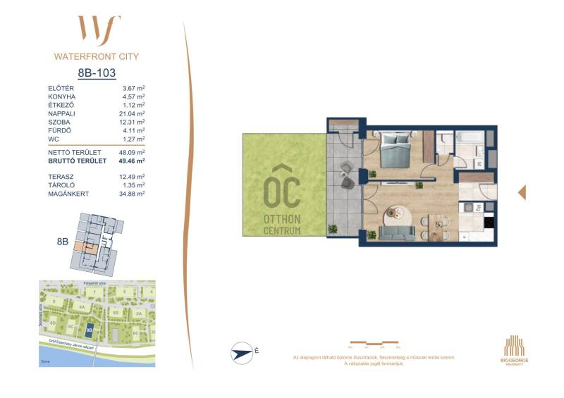 Projekt bemutatásaA projektrőlA Waterfront City egy új, modern városnegyed a 3. kerületben, ahol a természet közelsége és a városi kényelem tökéletes egyensúlyban van. A Duna-part közvetlen szomszédságában elhelyezkedő fejlesztés különleges atmoszférát kínál: a sétányt új épületek határolják, üzletekkel, kávézókkal és szolgáltatásokkal, amelyek élhető közösségi teret teremtenek.A 13 emeletes lakóépületből lenyűgöző örökpanoráma nyílik a budai hegyekre és a folyóra, a tágas teraszok pedig ideálisak a pihenéshez vagy a baráti összejövetelekhez. A zöldtetők, parkosított terek és fenntartható megoldások – mint az energiatakarékos rendszerek és okos otthon funkciók – mind hozzájárulnak a modern, környezettudatos életstílushoz.Látogass el értékesítési irodánkba, és tekintsd meg a városnegyed makettjét személyesen! Ismerd meg, milyen lesz az élet Budapest egyik legizgalmasabb új fejlesztésében!Óbuda szívébenKépzeld el, ahogy egy napsütéses délelőttön Óbuda szívében sétálsz, a Duna közelsége frissítően hat rád, miközben a Folyamőr utca, a Miklós tér és a Bogdáni út által határolt, öt hektáros területre érsz. A levegőben ott van a város történelme, mégis minden részletében a jövő hívogat.A 50 000 négyzetméteres területen egy hangulatos sétány vezet végig, amely egyenesen az óbudai Fő térre visz – mindössze 600 méterre. Ez a sétány nem csupán összeköt, hanem élményt nyújt: a Kolosy térről induló Óbudai Promenád részeként a város egyik legélhetőbb, legpezsgőbb szakaszán haladsz végig. És ha biciklivel érkeznél? A nemzetközi kerékpárút is itt halad el, Szentendre felé vezetve.Az 5. ütemben épülő 149 lakás mindegyike egyedi hangulatot kínál. Ahogy belépsz egy-egy otthonba, a hatalmas üvegfelületeken át beáradó fény és a tágas, szellős terek azonnal magukkal ragadnak. A kilátás? A Kaszap István park zöldje nyújt békét, míg a felsőbb emeletekről a Budai-hegység örökpanorámája tárul eléd – minden nap egy új festmény az ablakodban.A 6. ütemben 316 modern lakás épül, tágas teraszokkal és lenyűgöző kilátással a Dunára és a budai hegyekre. A lakók kényelmét őrszolgálat, kamerarendszer, mélygarázs, vendéglátóhelyek, belső park, játszótér és E-autó töltők szolgálják. Ez a projekt utolsó üteme, amely még közvetlen Duna-parti kapcsolattal rendelkezik.