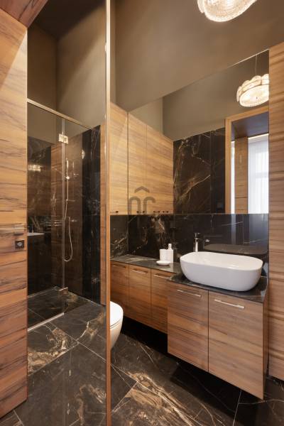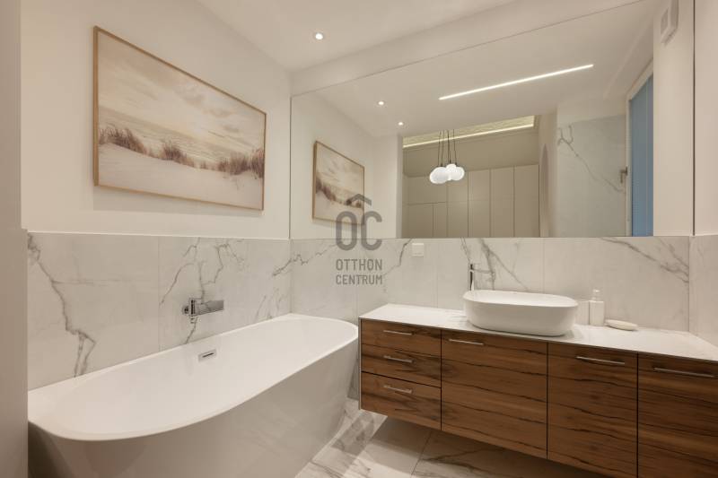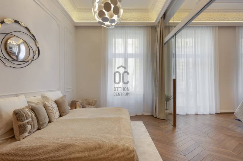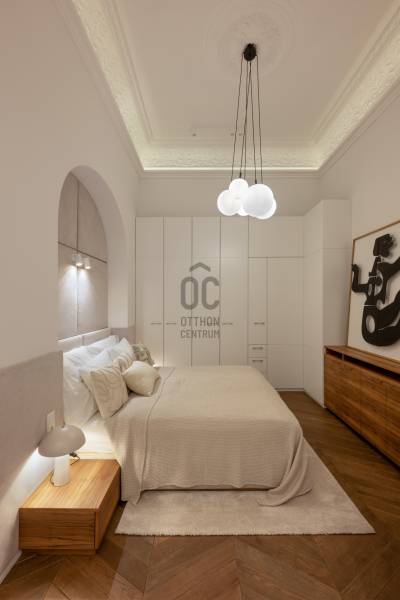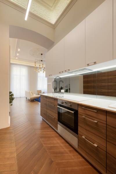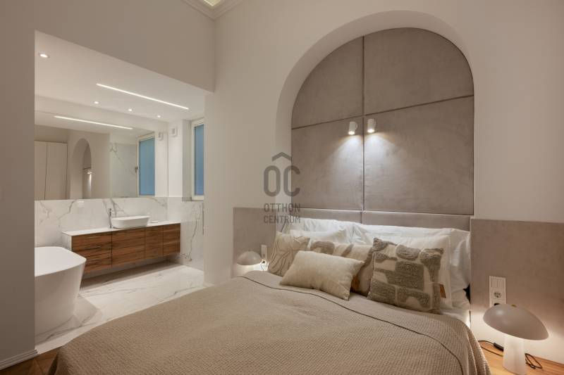 Felújított házban, kortárs polgári lakás. Üdv itthon! RÖVID ÖSSZEFOGLALÓBudapest V. kerületében, a Kálmán Imre utcában helyezkedik el ez az 1. emeleti, 80 négyzetméteres, felújított lakás. Három szoba, két fürdőszoba, erkély és déli tájolású, világos terek jellemzik, miközben a korszerű padlófűtés és a közös pincerész-használat a mindennapi komfortot szolgálja. Az ingatlan egy klasszikus nagypolgári épületben található.LOKÁCIÓ – INFRASTRUKTÚRA ÉS VÁROSI KULTÚRALipótváros ezen része azok közé a városi környezetek közé tartozik, ahol az infrastruktúra és a kulturális jelenlét természetes egységet alkot. Historikus bérházak, rendezett utcák és kiszámítható városi működés határozza meg a környezet karakterét.A városi tér szerves eleme a Kossuth Lajos tér és a Parlament, a Szabadság tér zöldfelületeivel és éttermeivel, valamint a Duna-part rakparti sétánya. A kulturális tengely szintén ide kapcsolódik: a Vígszínház, a Budapesti Operettszínház, a Thália Színház, illetve a Nagymező utca színházi világa a környék mindennapjainak része. Kávézók, üzletek és találkozópontok veszik körül a Szent István Bazilikát, miközben a közeli koncert- és zenei helyszínek tovább erősítik a városrész értelmiségi, művészeti hangulatát.Közlekedési szempontból a környék kiemelkedően jól szervezett: elérhető az M2-es és M3-as metró, a 4–6-os villamos, valamint több buszjárat, amelyek gyors kapcsolatot biztosítanak Pest és Buda irányába.Hosszú távon ez a városrész azért működik jól, mert nemcsak kiszolgál, hanem tartalmat is ad. Élhető, értelmezhető és stabil értéket képvisel, akár saját használatra, akár befektetési céllal.AZ ÉPÜLETKálmán Imre, az utca névadója a 20. század egyik legismertebb magyar zeneszerzője, az operett nemzetközi rangú alakja. Már a századfordulótól kezdve olyan közeg formálódott itt, amely értelmiségi, művészeti és közéleti szereplőknek adott otthont. Ez a háttér nem látványos, hanem rétegzett érték. Történettel, identitással és stabil presztízzsel bíró városi környezet, amely hosszú távon is működőképessé teszi az itt álló épületeket.A homlokzat a századfordulós lipótvárosi bérházépítés jellegzetes példája. A tagolt ablakrend, a hangsúlyos párkányok, az íves nyílászáró-lezárások és a kőkonzolokra ültetett erkélyek világos szerkesztési rendet követnek, miközben gazdag részletképzéssel dolgoznak. A díszítések nem dekoratív túlzások, hanem a korszak városi arányérzékét tükrözik: az épület egyszerre elegáns és fegyelmezett. Ez az a típusú homlokzat, amely nem trendekhez kötődik, hanem egy jól működő városi korszak építészeti gondolkodását őrzi.LAKÁSÁtgondolt alaprajz és természetes térkapcsolatok határozzák meg a lakás működését. A háromszobás elrendezés világosan elkülöníti a közösségi és a privát funkciókat, mégis egységes rendszert alkot.A nappali a lakás súlypontja, amelyhez szervesen kapcsolódik az étkező és a konyha. Jó arányú tér, nagy nyílászárókkal és déli tájolással, amely kiegyensúlyozott fényviszonyokat biztosít. A nappalihoz közvetlenül kapcsolódó erkély valódi kiegészítő térként jelenik meg. Pontosan azt tudja ez a tér, amit egy jól megkomponált nagypolgári nappalinak tudnia kell: érzelmileg hat, miközben megőrzi fegyelmezett karakterét. Magas belmagasság és finoman restaurált stukkódíszes mennyezet jelöli ki a tér rangját. A rejtett peremvilágítás keretezi a mennyezetet, míg a meleg tónusú függesztékek ritmust és hangsúlyt adnak a térnek. Klasszikus fali tagolás teremti meg azt a nyugodt hátteret, amelyben a bútorok és műtárgyak érvényesülni tudnak. A központi festmény fókuszt ad, majd visszavezeti a tekintetet a tér egészére.Parkettarajzolat földeli a teret, miközben a textíliák és a szőnyeg lakhatóvá teszik ezt az eleganciát. Nem reprezentációs díszlet, hanem valóban használható nappali: beszélgetésre, jelenlétre, lassulásra.Az összhatás ereje az egyensúlyban rejlik.Semmi nem akar több lenni annál, ami – és ettől válik igazán erőssé.Két, méretében és funkciójában is jól elkülönülő hálószoba teszi alkalmassá az ingatlant családi használatra vagy reprezentatív városi otthonként. Hangulatuk visszafogott és megnyugtató, a nagypolgári arányok modern értelmezésével. Mindkét háló saját fürdőszobai kapcsolattal rendelkezik, ami intim, jól szervezett működést biztosít, akár mindennapi használatra, akár vendégek fogadására.Az íves részletek, a puha textíliák és a finom világítás kiegyensúlyozott, csendes tereket hoznak létre, ahol a fókusz egyértelműen a pihenésen és a komforton marad.A két fürdőszoba anyaghasználatában és hangulatában is egységes, mégis eltérő karaktert képvisel: egyik kádas, világosabb tónusú, a másik zuhanyzós, mélyebb, elegáns felületekkel. A természetes kőhatású burkolatok, az egyedi asztalos bútorok és a finom világítás nyugodt, időtálló atmoszférát teremtenek a mindennapokhoz. Praktikus elhelyezkedésükkel kényelmes, torlódásmentes működést biztosítanak.Teljes körű felújítás során a hangsúly a korszerű műszaki megoldásokon és az időtálló belső kialakításon volt. A padlófűtés egyenletes hőérzetet ad, miközben vizuálisan is szabadon hagyja a falakat és tereket.Közös pincerész használata egészíti ki a lakást, amely praktikus tárolási lehetőséget jelent a belvárosi elhelyezkedés mellett.Ez az otthon kiegyensúlyozott, jól használható terekre épít, amelyek hosszú távon is élhetők maradnak – akár saját lakhatásra, akár minőségi befektetésként, bérbeadás céljából.Ha olyan belvárosi lakást k