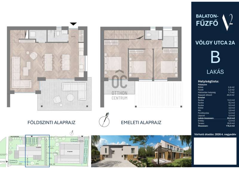 (2026.IV) V2AA ikerház fél: 93,0 m² lakótér + 25,0 m² erkély és terasz, saját kerttel, 129,9 MFt.250 m a Fövenyfürdő strandtól és a kikötőtől,5 lakás épül - kis lakásszámú fejlesztés - két épületben, ebből még 3 lakás elérhető.Földszinti elosztás – jól átgondolt terekkel:-előtér gardróbhellyel (2,6 m²) és belső, privát lépcső (6,0 m²),-tágas, egy légterű nappali–konyha–étkező (31,4 m²) közvetlen (20,0 m²) teraszkapcsolattal, amely délnyugati erkélyre/teraszra nyílik, kiváló helyszín családi vacsorákhoz, napozáshoz, baráti összejövetelekhez.-háztartási helyiség (1,7 m²), -külön fürdőszoba (3,0 m²).Emeleti elosztás – jól átgondolt terekkel:-2 kényelmes hálószoba (12,4 m² és 11,9 m²),-külön fürdőszoba (5,3 m²),-előtér (1,9 m²),-erkély: (8,1 m²).Parkolóhely:-udvari beállóhely: (1db) külön megvásárolható (1,5Mft.)Műszaki tartalom – alacsony rezsi, magas komfort:„A” energetikai besorolású, hőszivattyús rendszerrel,Felület fűtés–hűtés minden helyiségben,Választható, minőségi burkolatok és szaniterek,Téglafalak kívül-belül, korszerű, szigetelt nyílászárók, nappaliban emelő-toló ajtó,Szigetelt falazat és tető, elektromos redőny előkészítéssel,A műszaki megoldások hosszú távon kiszámítható, energiahatékony fenntartást biztosítanak, így a lakás kiváló választás állandó otthonnak is.Finanszírozás, környezet, parkolás:A lakás CSOK igénybevételére alkalmas,Kedvező finanszírozási konstrukciókkal megvásárolható, Balatonfűzfő teljes infrastruktúrával rendelkező, élhető város kevesebb mint 1 órára Budapesttől, Környezetében boltokkal, éttermekkel, vasútállomással rövid sétatávolságon belüli partszakasszal,A telken belül gépkocsi-beálló vásárolható.Elérhető lakások a fejlesztésben:V2BC (ez a lakás): 72,9 m² lakótér + 17,9 m² délnyugati terasz, emeleti lakás, 99,5 MFt,V2AB ikerház fél: 76,2 m² lakótér + 28 m² erkély és terasz, saját kerttel, 119,9 MFt,V2AA ikerház fél: 93,0 m² lakótér + 25 m² erkély és terasz, saját kerttel, 129,9 MFt.Akiknek ajánljuk:Az ingatlan ideális választás mindazoknak, akik a Balaton partján keresnek modern, napfényes, jól kihasználható terekkel rendelkező otthont – akár életvitelszerűen, akár nyaralóként vagy befektetésként.Projekt bemutatásaElérhető lakások a fejlesztésben:V2BC (ez a lakás): 72,9 m² lakótér + 17,9 m² délnyugati terasz, emeleti lakás, 99,5 MFt,V2AB ikerház fél: 76,2 m² lakótér + 28 m² erkély és terasz, saját kerttel, 119,9 MFt,V2AA ikerház fél: 93,0 m² lakótér + 25 m² erkély és terasz, saját kerttel, 129,9 MFt.250 m a Fövenyfürdő strandtól és a kikötőtől,5 lakás épül - kis lakásszámú fejlesztés - két épületben, ebből még 3 lakás elérhető.Parkolóhely:-udvari beállóhely: (1db) külön megvásárolható (1,5Mft.)-udvari beállóhely: (2db) külön megvásárolható (3,0Mft.)-udvari beállóhely: (1db) külön megvásárolható (1,5Mft.)Műszaki tartalom – alacsony rezsi, magas komfort:„A” energetikai besorolású, hőszivattyús rendszerrel,Felület fűtés–hűtés minden helyiségben,Választható, minőségi burkolatok és szaniterek,Téglafalak kívül-belül, korszerű, szigetelt nyílászárók, nappaliban emelő-toló ajtó,Szigetelt falazat és tető, elektromos redőny előkészítéssel,A műszaki megoldások hosszú távon kiszámítható, energiahatékony fenntartást biztosítanak, így a lakás kiváló választás állandó otthonnak is.Finanszírozás, környezet, parkolás:A lakás 3%-os Otthonfelújítási Hitel (Otthon Start) és CSOK igénybevételére alkalmas,Kedvező finanszírozási konstrukciókkal megvásárolható, Balatonfűzfő teljes infrastruktúrával rendelkező, élhető város kevesebb mint 1 órára Budapesttől, Környezetében boltokkal, éttermekkel, vasútállomással rövid sétatávolságon belüli partszakasszal,A telken belül gépkocsi-beálló vásárolható.Akiknek ajánljuk:Az ingatlan ideális választás mindazoknak, akik a Balaton partján keresnek modern, napfényes, jól kihasználható terekkel rendelkező otthont – akár életvitelszerűen, akár nyaralóként vagy befektetésként.