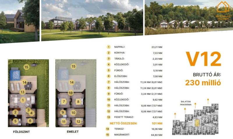 Balatonföldvár: Balatonföldvár fontos turisztikai célpont, nemcsak a magyarok, hanem más európai országok turistái számára is, természeti szépségei (például a löszhegy és a nagy virágos parkok), továbbá történelmi örökségei (például a kelta ösvény, a régi kúriák és villák) miatt számtalan szabadidős lehetőséget, valamint számos vízi sportot (vitorlázás, szörfözés, horgászat, evezés)Villák - kulcsrakész alapfelszereltség:100% tömör CLT Ausztriából.20 cm kőzetgyapot hőszigetelés.A+ energetikai besorolás.Fa hőszigetelő nyílászárók 3 rétegű üvegezéssel, tölgyfurnér melegburkolat.Porcelán greslap hidegburkolat.Villeroy fürdőszoba szaniterek,padlófűtés.Levegős hőszivattyú (VRV splitklíma), 2,5 kW napelem rendszer, elektromos redőny, szúnyogháló, beépített bútorok, homlokzati díszvilágítás.min. 26 m² teraszmin. 62 m² magánkert.Villák - választható opciók:Prémium konyhabútor konyhaszigettel, okosotthon rendszer, szauna (épületen belül), látvány design kandalló, 4 személyes prémium jacuzzi, gázos grillsütő.Privát zárt parkoló: 6.350.000. Ft.Privát elektromos autótöltő, kedvezményes hajóhely az új e-kikötőben.V.12.A további kérdésekkel és a megtekintéssel kapcsolatban kérem keressen a megadott mobil számon.
