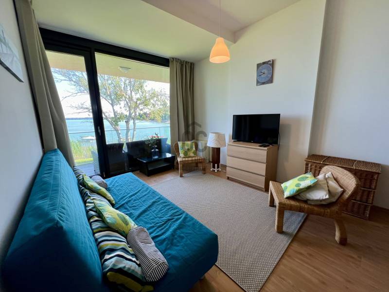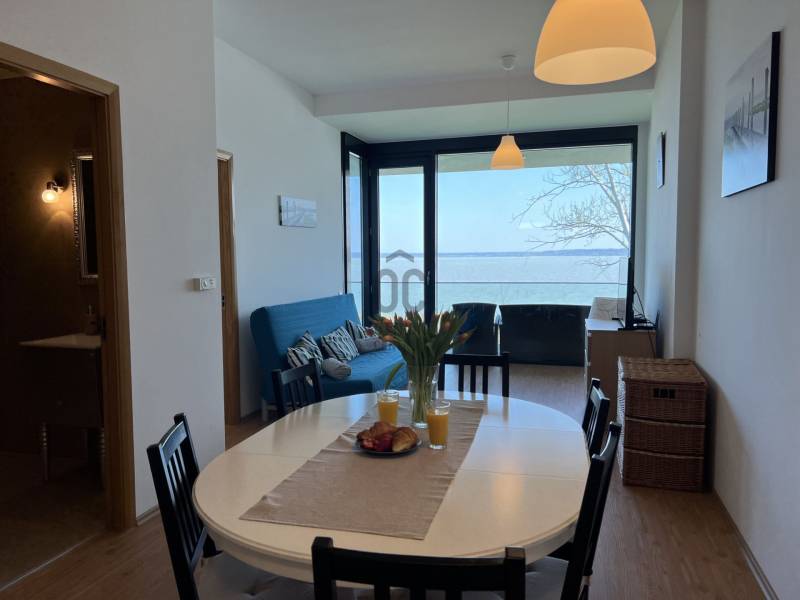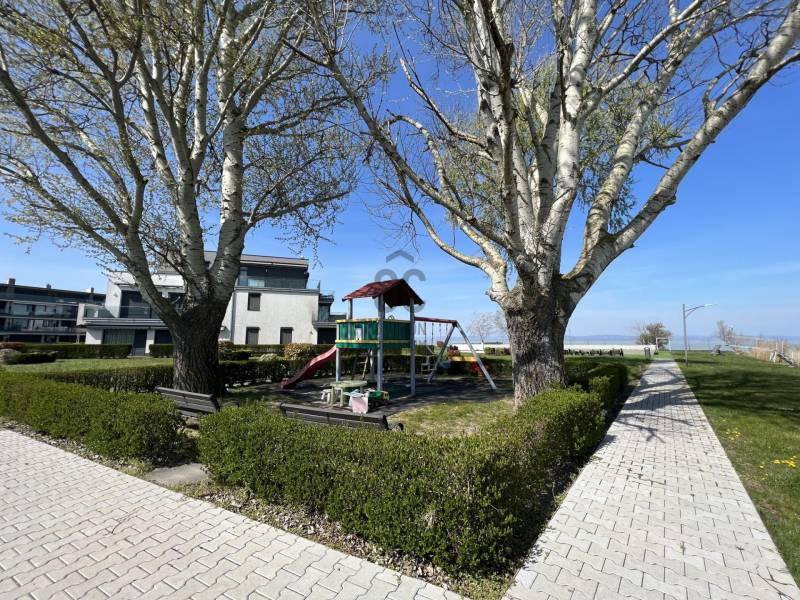 Megvételre kínálom ezt a ritka, keleti, balatoni panorámával rendelkező, 77 nm-es, 3 szobás, első emeleti luxus nyaralót. A lakás kiváló minőségű társasházban található, közvetlenül a Balaton partján, festői környezetben.Szeretne családjával, barátaival egy csodás helyszínen kikapcsolódni, minden kényelem és komfort közepette?Akkor ezt a lakást látnia kell!Az ingatlan főbb jellemzői:•Privát kert: A bejárat felől egy 73 nm-es, gondozott privát kert várja a tulajdonosát.•Kertkapcsolatos terasz: A bejáratnál egy 7 nm-es terasz biztosítja a kertkapcsolatot.•Balatoni terasz: Egy 13 nm-es, örök panorámás terasz nyílik a Balatonra.•Tároló: A bejárat mellett található saját tulajdonú 3 nm-es tároló.•Parkoló: A lakáshoz közeli, kényelmes parkolóhely.Belső Terek•Előtér: Beépített szekrény és mosógép.•Amerikai konyha: 12 nm-es, mosogatógéppel és étkezővel.•Nappali: 21 nm-es, padlótól plafonig érő üvegfallal, lenyűgöző panorámával.•Hálószobák: Kettő hálószoba, az egyik a privát kertre, a másik a Balatonra néző kilátással.•Fürdőszoba: Káddal és WC-vel.•Különálló WC: Kényelmes elrendezésű.Műszaki tartalom•Melegvíz ellátás: Beépített 120 literes Ariston villanybojler.•Fűtés-klíma: Norvég Nobo fűtőpanel, Hűtő-fűtő fan-coil berendezések.•Kandalló lehetőség: Nappaliban kialakított kémény.Közösségi szolgáltatások•Biztonság: 0-24 órás portaszolgálat.•Kényelmi szolgáltatások: 25 méteres feszített víztükrű medence, két gyermekmedence, játszótér, gondozott kert, saját strand és stég.A közös költség tartalmazza a portaszolgálatot, közös helyiségek takarítását, kertész díját, medence karbantartást, felújítási alapot, szemétszállítást, víz-, hűtés-fűtés átalányt.Az ingatlan eladási ára nem tartalmazza a parkolóhelyet és a tárolót.•Parkolóhely ára: 6 millió Ft•Tároló ára: 4 millió FtEz az ingatlan tökéletes választás, legyen szó saját használatról, kiadásról, szezonális vagy állandó lakhatásról. Az ingatlan frekventált lokációjának, örök panorámájának és magas minőségű kivitelezésének köszönhetően folyamatos értéknövekedés várható.Ne hagyja ki ezt a kivételes lehetőséget! Komfort, kényelem, minőség és egy álomszerű környezet várja új tulajdonosát.