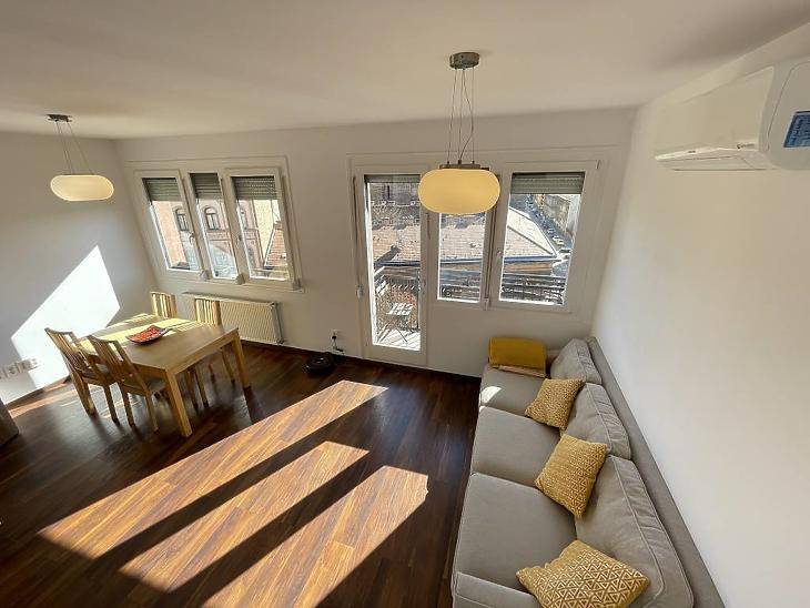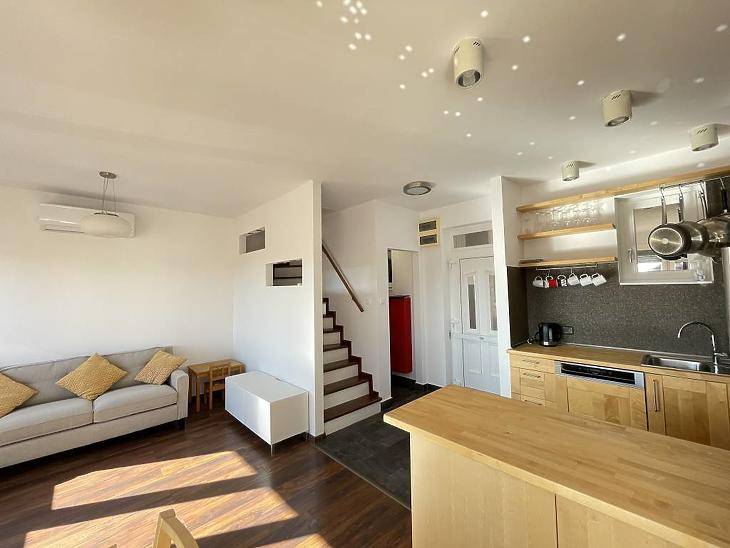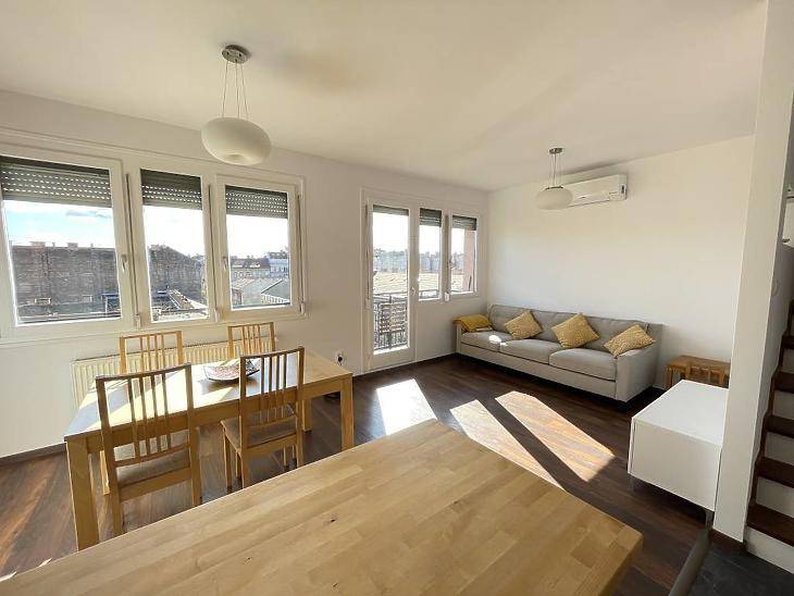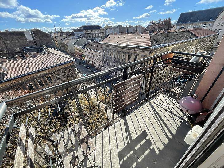 Eladó a VII. kerületben, a Jósika utcában, a Szenes Hanna park mellet egy igazán különleges hangulatú, panorámás kilátással rendelkező, nettó 60, bruttó pedig 80 nm-es, belső kétszintes (duplex) lakás egy 2007-ben épült, liftes társasház 5. emeletén.A modern elrendezésű, felújított állapotú ingatlan amerikai konyhás nappalival és két külön nyíló hálószobával rendelkezik, így kényelmes és jól elkülönülő életteret biztosít akár pároknak, akár kisebb családnak, de befektetésnek is kiváló választás.A nappaliból egy 2 nm-es erkély nyílik, ahonnan kellemes, nyitott panoráma tárul elénk, ami igazán egyedi atmoszférát ad az otthonnak. A felső emeleti elhelyezkedésnek köszönhetően a lakás világos, csendes. Az ingatlan tavaly friss festést kapott, négy éve pedig két új klímaberendezést szereltek be, aminek a kültéri egységei a tetőn kaptak helyet. Az ablakok redőnnyel és szúnyoghálóval is fel vannak szerelve, így a komfort minden évszakban biztosított.A fűtés házközponti rendszerű, így a fenntartás kiszámítható és kedvező. A lakáshoz saját pince tároló is tartozik, amely praktikus és kényelmes tárolási lehetőséget nyújt. A társasház rendezett, modern, liftes, jó lakóközösséggel. A környék infrastruktúrája kiváló: üzletek, éttermek, kávézók, gyógyszertár, iskola, óvoda és minden fontos szolgáltatás pár perces sétával elérhető.A tömegközlekedés kiemelkedően jó, így a város bármely pontja gyorsan és egyszerűen megközelíthető. Ha egy stílusos, felújított, panorámás, belvárosi otthont keres, amely értékálló befektetés is egyben, ezt a lakást mindenképpen érdemes személyesen is megtekinteni.A hirdetés tájékoztató jellegű!