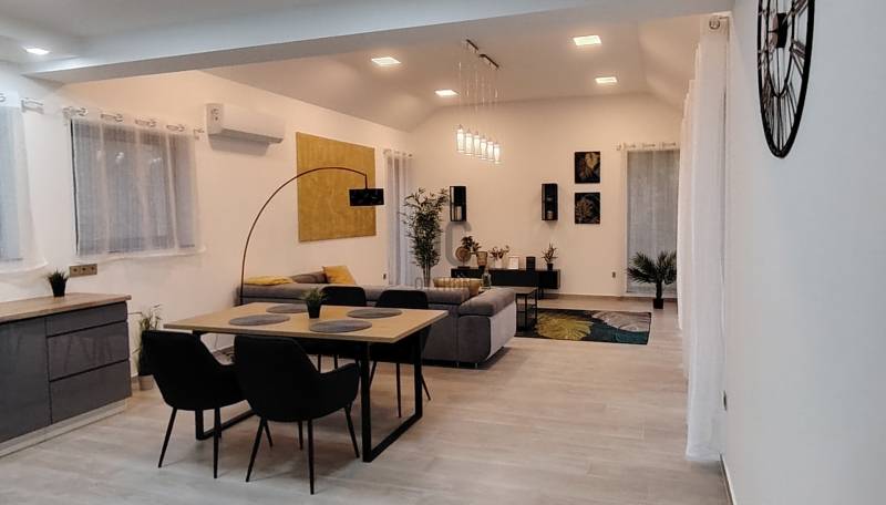 Fedezze fel ezt a kivételes lehetőséget Szentendre, Pismány városrészében, ahol egy új építésű, idén elkészült, modern ház várja Önt és családját.Az ingatlan a legmagasabb minőségi elvárásoknak megfelelően készült, közel 240 négyzetméteres alapterületén a nagyméretű világos nappalin, konyha-étkezőn, két fürdőszobán, mosókonyhán felül, 4 szoba és gardrób, plusz egy dolgozó sarok várja családjával.A nagyméretű, majdnem teljesen sík telken, ősfák és tudatosan telepített, gondozott örökzöldek, valamint a telek végében csordogáló patak adják a telek hangulatát. A békés, patakparti környezet, a madárcsicsergés, a friss levegő és a zöld panoráma, minden nap feltölti energiával, a tiszta, friss levegő sétára, futásra, túrázásra kerékpározásra csábítja.A ház tervezésekor, majd kivitelezése során a telek egyedi alaprajzának adottságait és meglévő növényzetének megóvása mellett az új növényzet telepítése is kiemelt szerepet kapott. Az újépítésű, Ytong falazatú, hőszivattyús fűtésrendszerrel ellátott épület, korszerű hőszigeteléssel, nyílászárókkal és energiatakarékos megoldásokkal biztosítja a kellemes klímát és az alacsony fenntartási költségeket egész évben. A zöldre néző nagy üvegfelületek beengedik a fényt, miközben a tágas, kertkapcsolatos nappali, a stílusos étkezővel és a nagyméretű terasszal a kényelmet és az eleganciát ötvözik.Több, mint 1000 négyzetméteres telkével ideális választás mindazok számára, akik a városi élet nyüzsgésétől távol, mégis könnyen megközelíthető helyen szeretnének élni. Az ingatlanban öt tágas szoba található, amelyek lehetőséget adnak a családi életre, valamint vendégek fogadására. A két fürdőszoba kényelmet biztosít a mindennapok során, így a reggeli rohanásban sem kell kompromisszumot kötnie. A közel 50 négyzetméteres terasz tökéletes helyszín a pihenésre, ahol élvezheti a gyönyörű panorámát, amely a környék varázsát tükrözi. Az újépítésű ingatlan a hőszivattyús fűtés és a klímaberendezés pedig garantálja a kellemes hőmérsékletet télen és nyáron egyaránt. A garázsban egy autó kényelmesen parkolhat, ezen felül a telken további két autó is elfér, így nem kell aggódnia a parkolási lehetőségek miatt.A környék csendes és biztonságos, ideális választás családok számára. Szentendre számos lehetőséget kínál a szabadidős tevékenységekre, legyen szó kirándulásokról, kerékpározásról vagy a helyi éttermek és kávézók felfedezéséről vagy kulturális élményekről, eseményekről. A közlekedési lehetőségek is kiválóak, hiszen a város könnyen megközelíthető autóval, de a tömegközlekedés is jól kiépített, így Szentendre és Budapest között gyorsan és kényelmesen közlekedhet. A családbarát ingatlan a természet nyugalmát és a városi kényelem közelségét kínálja, egyszerűen megközelíthető, csendes utcában, mégis percekre a városközponttól, óvodától, iskoláktól, üzletektől és tömegközlekedéstől.Ez az ingatlan nemcsak egy otthon, hanem egy életstílus megtestesítője, amely lehetőséget kínál az aktív, de mégis nyugodt életvitelre.