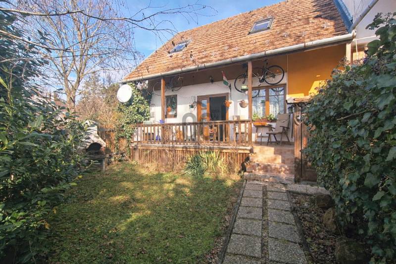 Eladásra kínáljuk gondosan karbantartott, kétszintes, sorház jellegű családi házat Budakeszi egyik legszebb és legkeresettebb részén, Virágvölgy csendes utcájában, a 12. kerület határán, közvetlenül az erdő szomszédságában.Az ingatlan a város északkeleti határán, a hajdani villa-üdülő övezetben, kiemelt presztízsű környezetben, a János-hegy közvetlen közelében helyezkedik el – ideális választás azok számára, akik a természet közelségét és a városi elérhetőséget egyaránt fontosnak tartják.Főbb paraméterekLakóterület: 95 m²Elrendezés: nappali + 3 külön nyíló szobaÉpület: 2 szintes, sorház jellegű (nincs közös fala a szomszéd ingatlannal)Földszint:előszobavilágos nappali valódi fatüzelésű kandallóvalkonyha - étkezőkádas fürdőszoba - wcteraszTetőtér:2 hálószoba (egyik hűtő-fűtő klímával)félszoba+ padlás tárolásraMűszaki és állapotAz ingatlan néhány éve belső felújításon esett átEgyedi fa nyílászárók, 3 kamrás üvegezésselBiztonsági zárral ellátott bejárati ajtóTetőtéri ablakok működőképesek, esztétikai felújítást igényelnekTisztasági festés után beköltözhetőKert és telekIntim, körbe kerített saját kert, ideális pihenésreOsztatlan közös tulajdonú telek, ügyvédi megosztássalKözművek – fontos információA vízvezeték-rendszer 2025 nyarán részben szétválasztásra kerültA külön csövek már lefektetésre kerültek, bekötésük és az önálló vízórák telepítése szükséges a teljes leváláshozJelenleg egy új közös gerincen történik az ellátásElhelyezkedés és közlekedésRendezett, aszfaltozott utcában, a városközponthoz közel.Parkolás a telken belül. Tömegközlekedés: Budapest–Budakeszi határán, kiváló elérhetőség:22, 22A, 222, 188, 188E és távolsági buszok 6-7 perc sétaSzéll Kálmán tér kb. 20 perc alatt elérhetőBevásárlás, gyógyszertár, orvos, éttermek ~5 perc sétára
