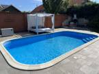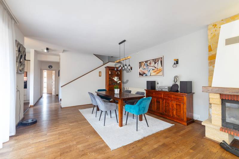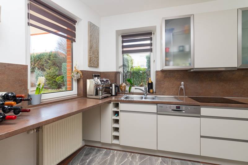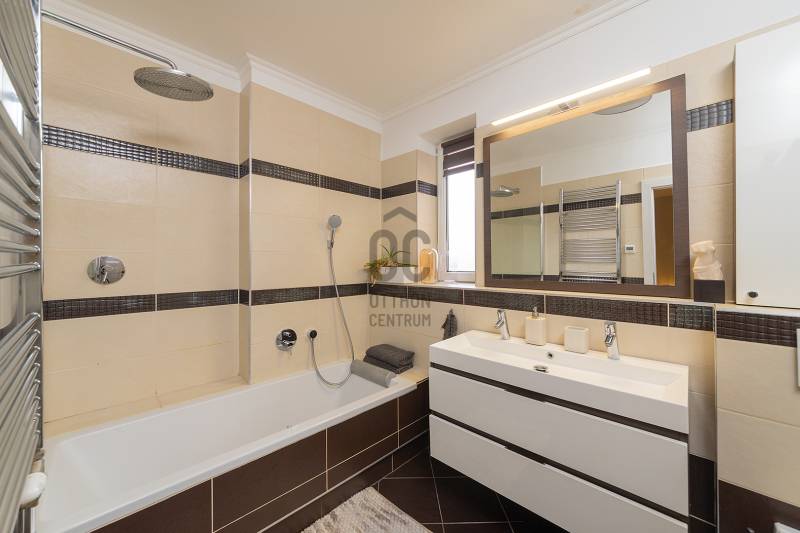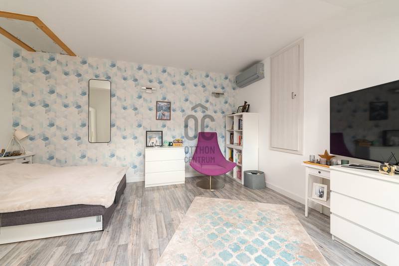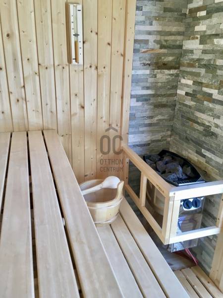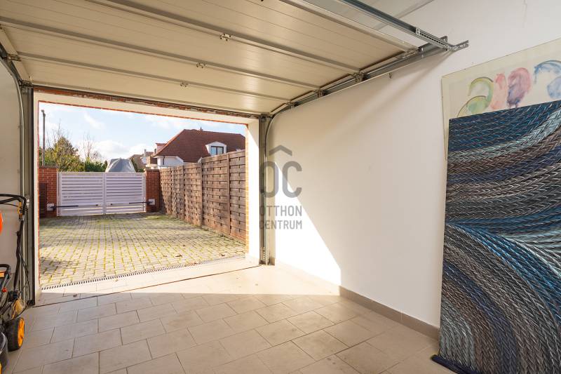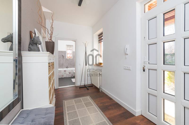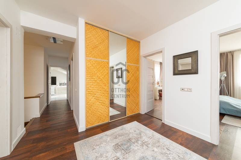 XVII. kerületben a méltán kedvelt Pesti úti lakóparkban kínálunk megvásárlásra egy nappali+ 5 szobás, sok extrával felszerelt kiváló állapotú családi házat 605 nm-es telekkel. A lakóépület 2002-ben épült, azóta a Tulajdonosa esztétikailag és műszakilag is felújította, így a mai igényeknek maximálisan megfelel. A ház belső elosztása kiváló, nagyobb létszámú családnak, két generációnak is kényelmes Otthona lehet. A földszinten a tágas előszobából nyílik a felújított fürdőszoba, egy nagy méretű szoba, ez az egység külön lakrészként is funkcionálhat. A garázsból közvetlenül a lakásba jutunk. A ház központi része a közel 50 nm-es, napfényben úszó ( DK-i tájolás) nagyobb belmagasságú nappali az étkezővel, innen közvetlen kertkapcsolatunk van a nagy méretű teraszon keresztül. A konyhában új, gépesített (Bosch elektromos főzőlap, mosogatógép, sütő, mikró), német minőségi konyhabútor található, mely a vételár részét képezi. A nappaliban lévő fatüzelésű kandalló gondoskodik télen a meghitt hangulatról. Az emeletre kényelmes lépcső vezet, ahol négy tágas hálószoba, egy újszerű fürdőszoba és egy háztartási helyiség kapott helyet. Itt egy padlástéri helyiség még beépíthető, tárolásra kiválóan alkalmas. A mai energiaérzékeny világban fontos, hogy a rezsi ne legyen magas. Az ingatlan 10 KW-os napelemrendszerrel rendelkezik (még 7 évig szaldós), így a villanyszámla nulla. Elektromos autó töltő lett kiépítve, 5 db inverteres hűtő-fűtő klíma lett felszerelve, a fűtést és a használati melegvizet egy fiatal kondenzációs kazán biztosítja. Az ablakokban az üvegezés nemrég lett cserélve, továbbá a belső ajtókat is megújultak, modern, minőségi nyílászárók lettek beépítve. A hátsó, növényekkel körbeültetett intim kertben egy gépesített, épített medence került kialakításra napozóterasszal, a medence mérete 7,5 m x 4 m, hőszivattyú fűti a vizét.A medence mellett kapott helyet a 4 személyes finn szauna, továbbá kerti sütögető, bográcsozó is. A fűtött garázsban egy autó elfér, az előkertben további két autónak van hely, elektromos kapukon történik a bejutás, videós beléptető rendszer lett kialakítva. Az utcai kerítés cserélve lett porfestett alumínium kerítésre. A növényeket a 3 körös automata öntözőrendszer locsolja, a biztonságról riasztó gondoskodik. A környék kifejezetten szép, nívós, kulturált szomszédokkal, csendes kertvárosi környezet. Séta távolságra több bevásárlási lehetőség (Lidl, Spar), benzinkút, nagy játszótér, Home Centerben sok üzlet megtalálható, buszmegálló is rövid időn belül elérhető (97E, 202E).Ez az ingatlan a \"Felező csomag\" megbízási portfólióhoz tartozik. Részletek az Otthon Centrum weboldalán.