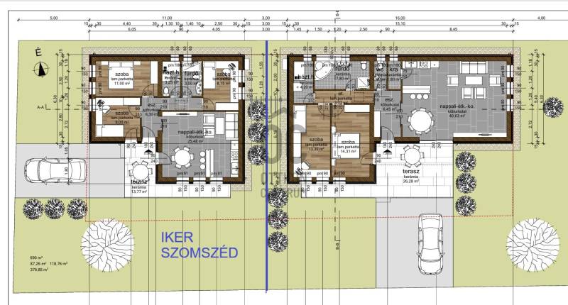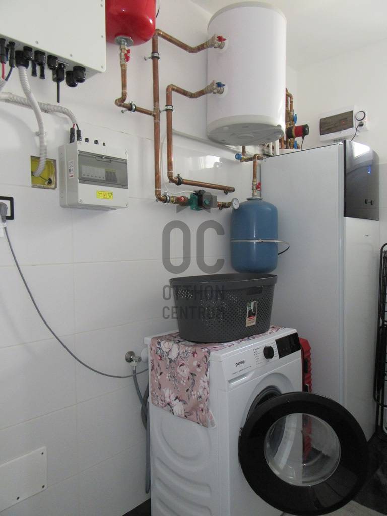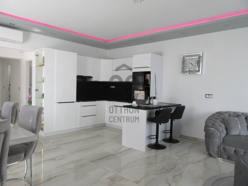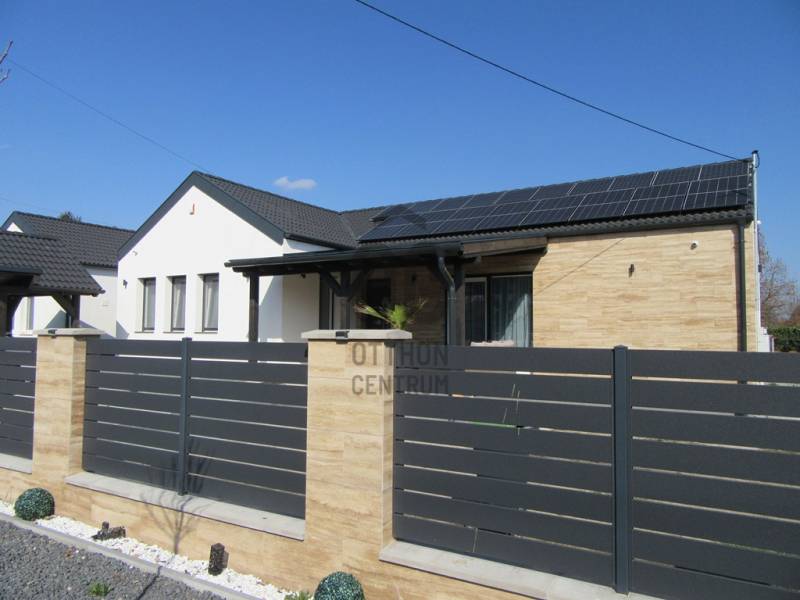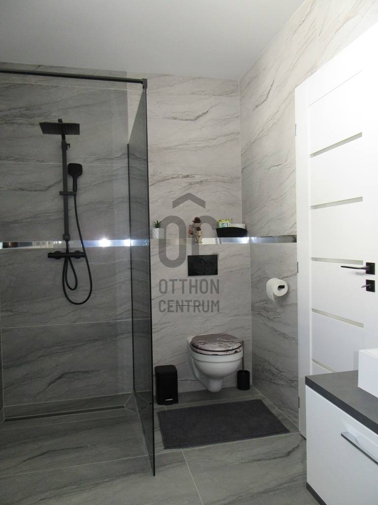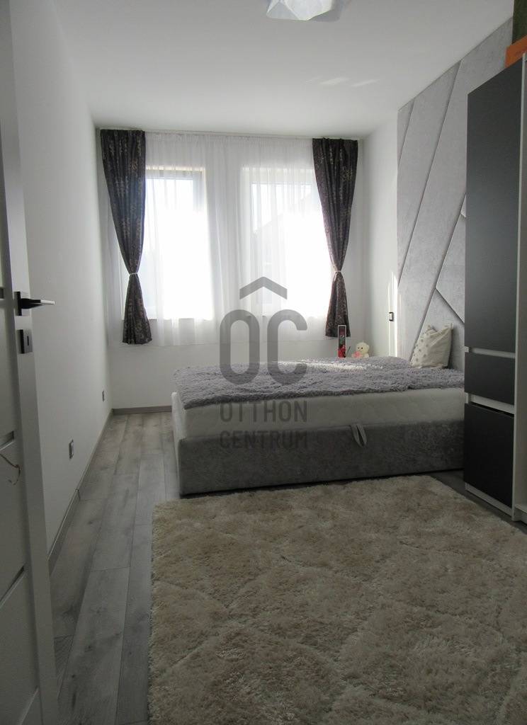 Eladó egy 2025-ben épült, exkluzív kivitelezésű ikerház egyik lakóegysége, ahol a két házrészt egy külön tároló választja el egymástól, biztosítva a zavartalan nyugalmat és a nagyobb privát szférát.Az ingatlan modern építészeti megoldásokkal és kiemelkedő műszaki tartalommal készült. A falazat 30 cm-es Porotherm téglából épült, amelyet 15 cm-es homlokzati hőszigetelés egészít ki. Az energiahatékonyságot 10 cm lépésálló aljzatszigetelés és 20 cm födémszigetelés biztosítja. A házban háromrétegű üvegezésű nyílászárók találhatók, elektromos redőnnyel és szúnyoghálóval felszerelve.A fűtésről 8 kW-os Daikin hőszivattyúval működő korszerű padlófűtés gondoskodik, míg a kellemes hőmérsékletet a nyári hónapokban két inverteres klímaberendezés biztosítja. Az energiahatékony működést 8 kW-os napelemes rendszer és H tarifa támogatja.A belső tér kialakítása stílusos és magas minőséget képvisel: igényes burkolatok, luxus kategóriájú fürdőszoba, valamint teljesen gépesített, modern beépített konyha került kialakításra. A nappali különleges hangulatát egy beépített elektromos kandalló teszi még elegánsabbá és otthonosabbá.A biztonságot kamerarendszer és riasztó szolgálja, míg a mindennapi kényelmet elektromos kapu növeli.A nappaliból egy 26 m²-es, déli tájolású terasz nyílik, amely tökéletes helyszínt biztosít pihenéshez, családi étkezésekhez vagy baráti összejövetelekhez. Az udvarban fedett, térkövezett, kétállásos kocsibeálló található.Az ingatlan tehermentes és azonnal birtokba vehető, így új tulajdonosa akár rövid időn belül élvezheti ezt a modern, energiatakarékos otthont.Ez a ház ideális választás mindazok számára, akik minőségi kivitelezést, korszerű technológiát és elegáns, nyugodt otthoni környezetet keresnek.Az ingatlan rugalmasan nézhető, hívjon, egyeztessünk időpontot.