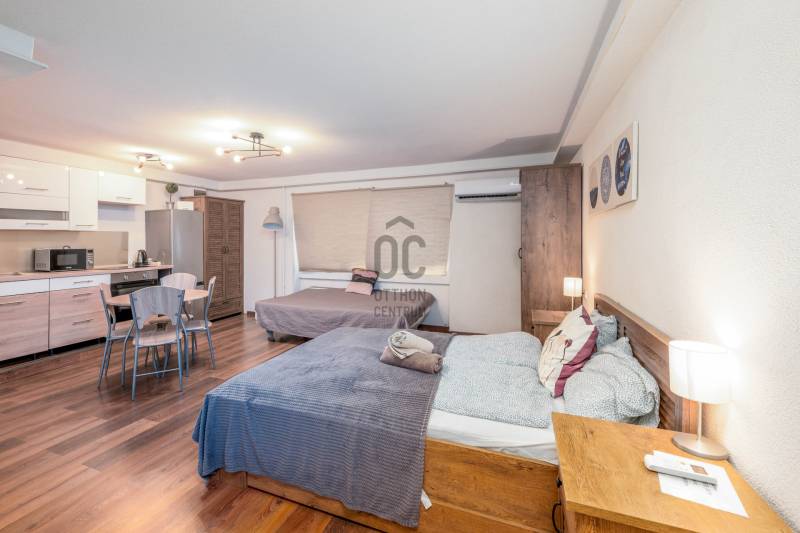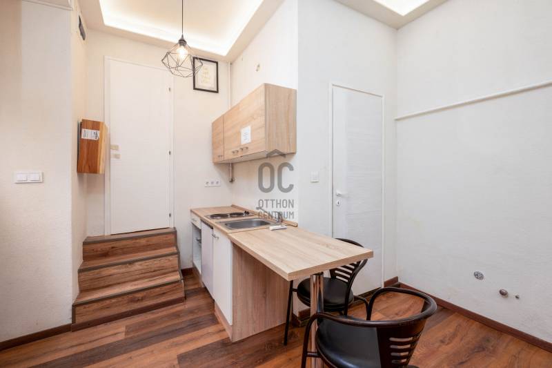 Eladó egy különleges kialakítású, 49 m²-es lakás, amely jelenleg két különálló lakrészként funkcionál. A lakás két szobával és két fürdőszobával rendelkezik, így ideális megoldás lehet diákoknak, testvéreknek vagy barátoknak, akik szeretnének együtt lakni, mégis megőrizni a saját privát terüket.A lakás különlegessége, hogy egyben van, mégis két jól elkülönülő élettérből áll, így befektetési szempontból is rendkívül praktikus. Hosszútávú kiadásra kiváló, hiszen a környék rendkívül népszerű a külföldi és magyar egyetemisták körében is.Az ingatlanhoz tartozik egy 16 m²-es \"terasz\", amely a félemeleten található, és kellemes plusz életteret biztosít. Az egyik lakrész 240 cm, a másik 300 cm belmagasságú, ami változatos térérzetet ad a lakásnak. A nyugati fekvésű udvari nézet csendes és nyugodt környezetet biztosít a belváros szívében.A komfortérzetről fűtő-hűtő klíma gondoskodik minden évszakban. Az ingatlanban nincs gázvezeték, a közös költség mindössze 19.000 Ft, amely a vízfogyasztást is tartalmazza.A lakás teljes bútorzattal és berendezéssel együtt eladó, így akár azonnal költözhető vagy kiadható.A környék páratlan: a Liszt Ferenc tér tele van hangulatos éttermekkel, kávézókkal és kulturális programokkal. Néhány perc sétára található az Oktogon, a Zeneakadémia, valamint számos egyetem és szórakozási lehetőség.Az ingatlan ritkaságnak számít ezen a környéken, különleges kialakítása miatt pedig valódi kuriózum a belvárosi lakások között.Ha felkeltette érdeklődését ez a remek lehetőség, keressen bizalommal, és egyeztessünk időpontot a megtekintésre!
