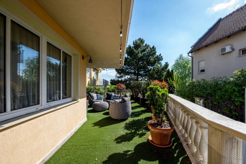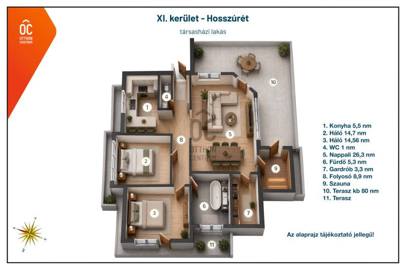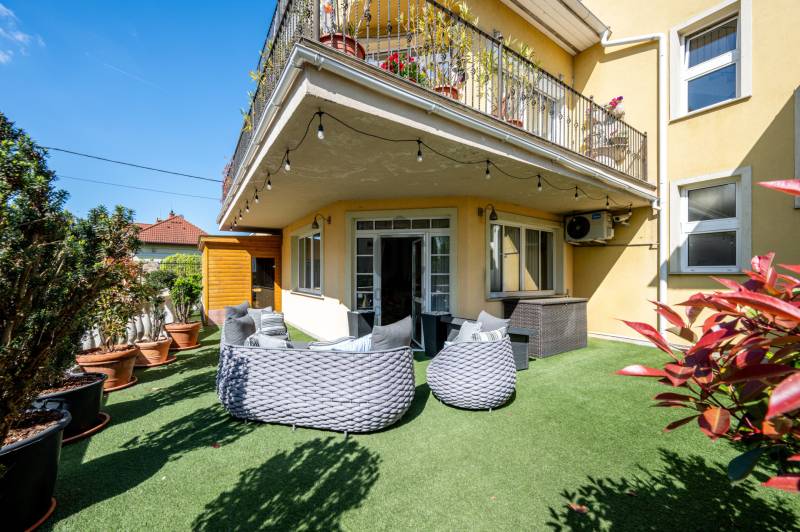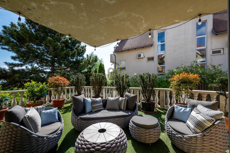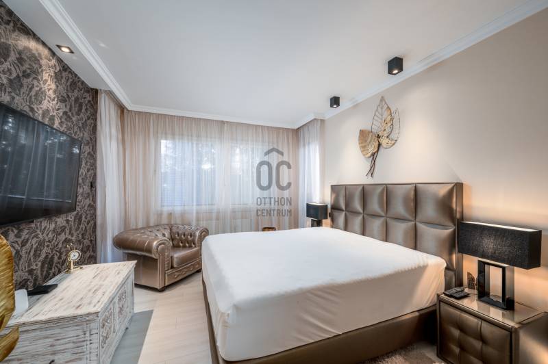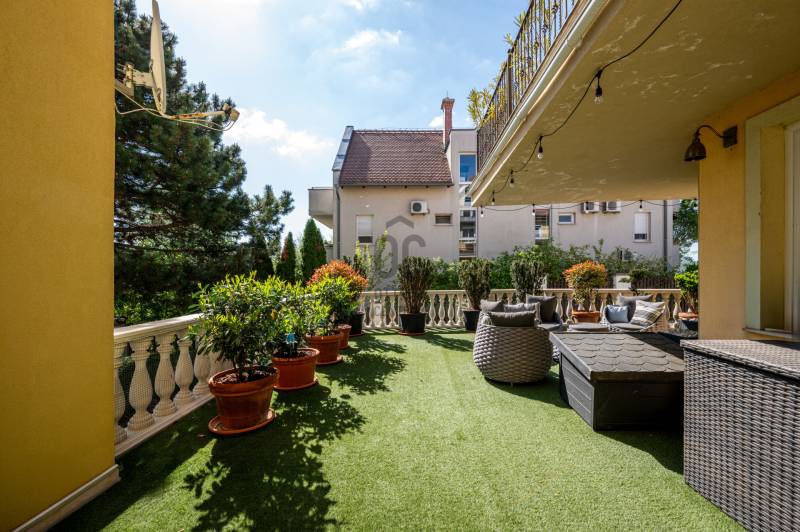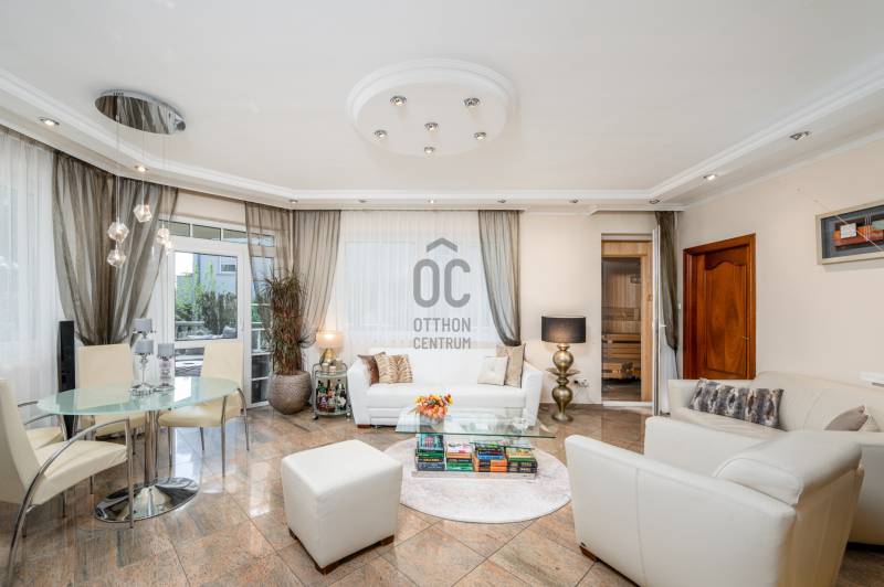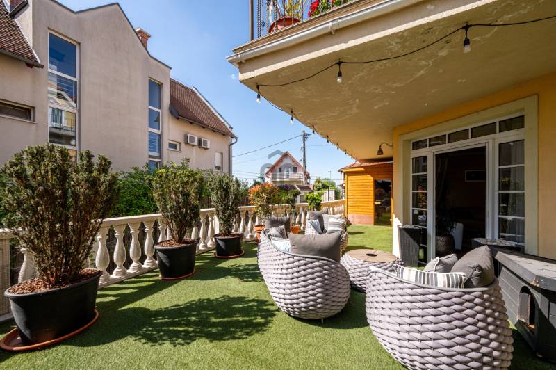 A XI. kerület egyik legcsendesebb, forgalomtól szinte teljesen mentes utcájában, Hosszúréten kínálom megvételre ezt az igazán különleges adottságokkal rendelkező, 97 m²-es, 3 szobás lakást, amely ötvözi a város közelségét és a nyugalom luxusát.A 2005-ben épült, mindössze 6 lakásos, szinteltolásos társasház kialakításának köszönhetően nincs falszomszéd, így a privát szféra maximálisan biztosított.A lakás déli fekvésű, napfényes terekkel, és minden szobából közvetlen kijárattal rendelkezik a lenyűgöző, közel 80 m²-es teraszra, ahonnan páratlan kilátás nyílik a városra. A tágas terasz akár 8 fős társaság fogadására is ideális, tökéletes helyszíne baráti összejöveteleknek vagy csendes reggeli kávézásoknak.Az ingatlan belső kialakítása elegáns és időtálló: prémium gránit burkolatok, letisztult design, magas minőségű kivitelezés jellemzi.Főbb jellemzők:- világos nappali működő, bekötött kandallóval- nappaliból nyíló privát szauna- modern hőszivattyús padlófűtés- klíma minden szobában- minden szobából teraszkapcsolat- bútorozottan eladóA lakáshoz tartozik egy tároló, valamint egy teremgarázs hely elektromos autó töltési lehetőséggel, amely kötelezően megvásárolandó (ára: 12 M Ft).A lakók kényelmét egy 400 m²-es közös kert is szolgálja, amely tovább növeli az ingatlan exkluzivitását.Közös költség: 40.000 Ft/hóEz az otthon ideális választás azok számára, akik nem szeretnének kompromisszumot kötni: városi közelség, mégis nyugodt, zöld környezet – egy helyen.
